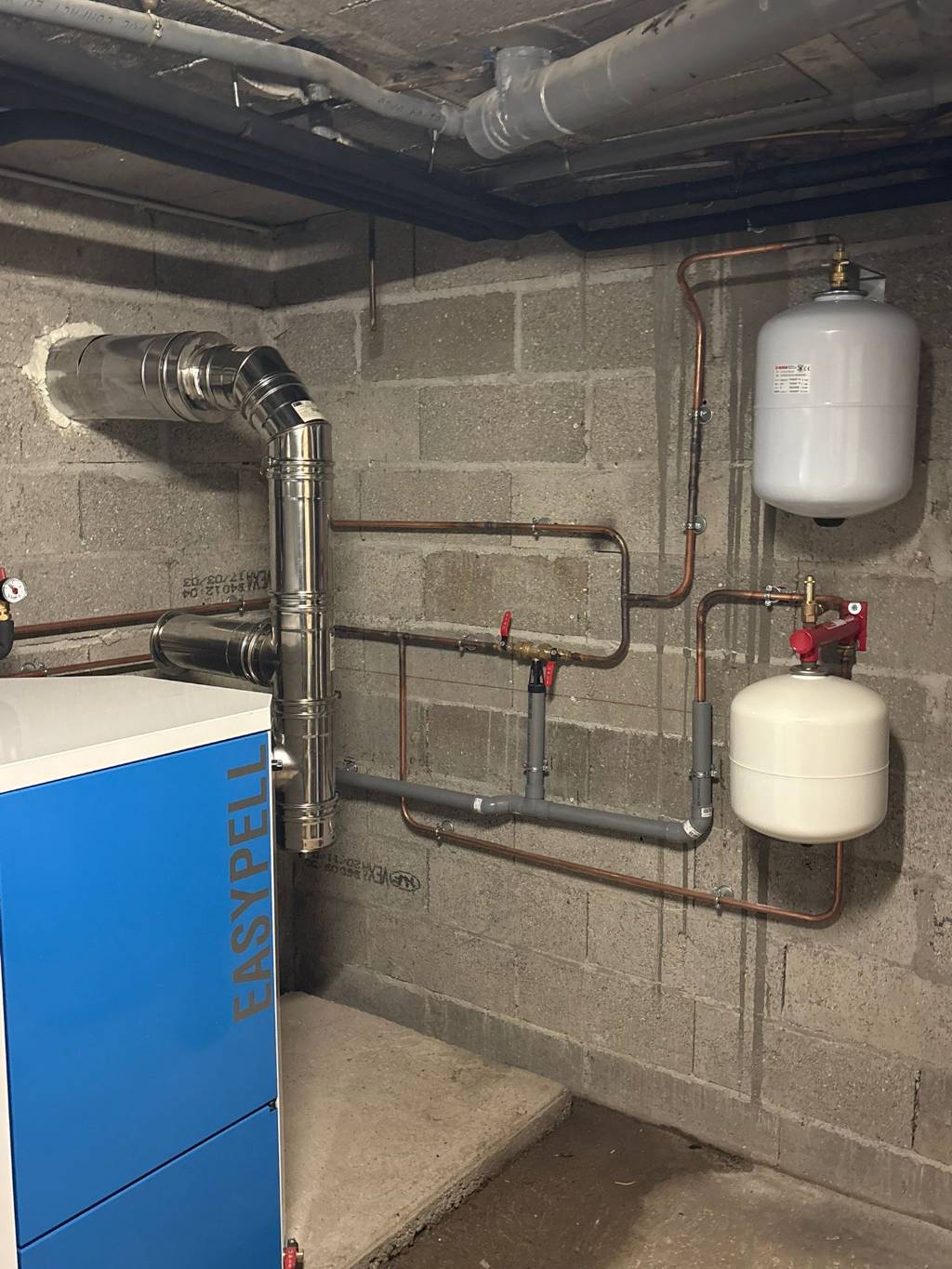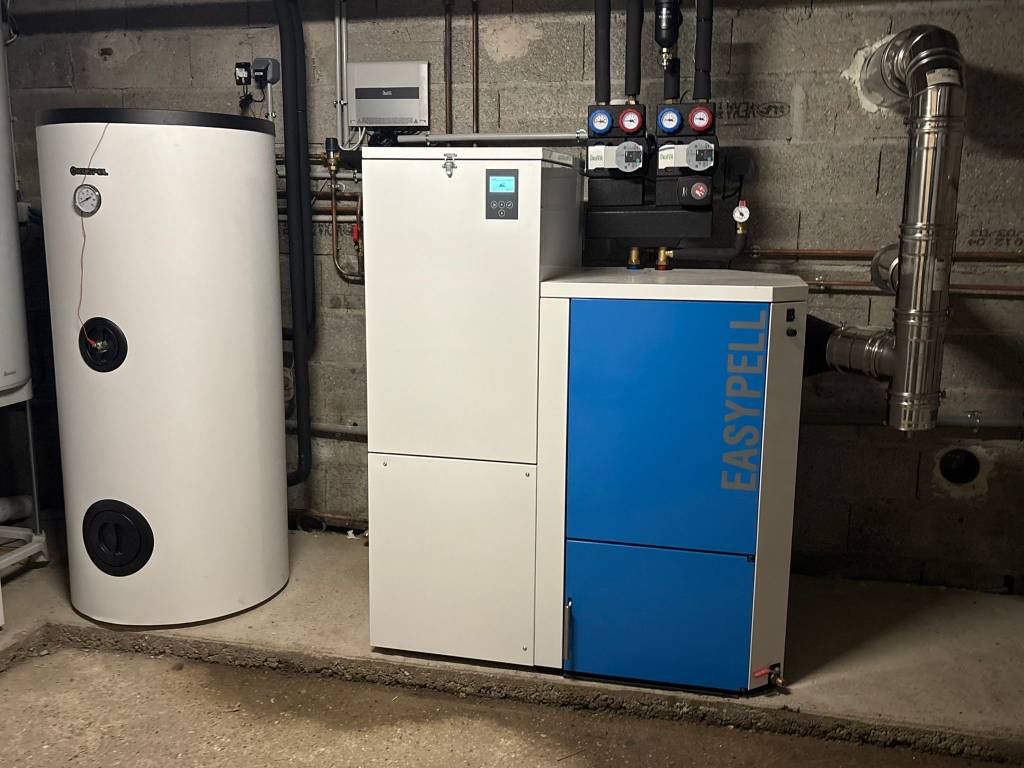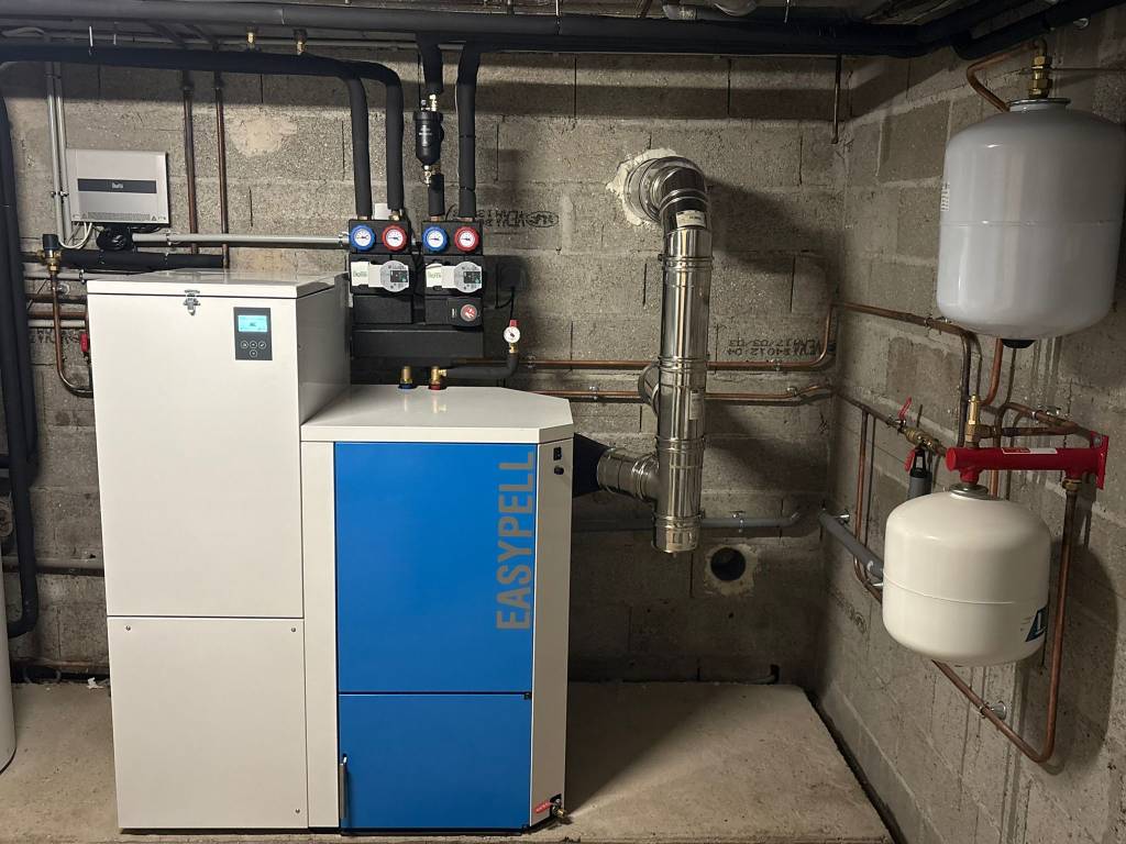 Pose d'une chaudière à granulés Easypell à chargement manuel & création réseau de chauffage complet, tubage extérieur isolé - RGE QUALIBOIS 27/76